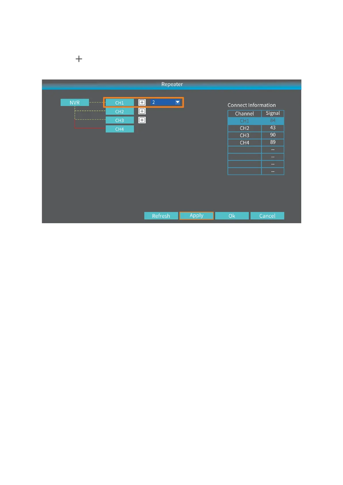 Klikněte na za CH1/IPCAM1, poté zvolte 2 pro nastavení IPCAM1 jako opakovač. To