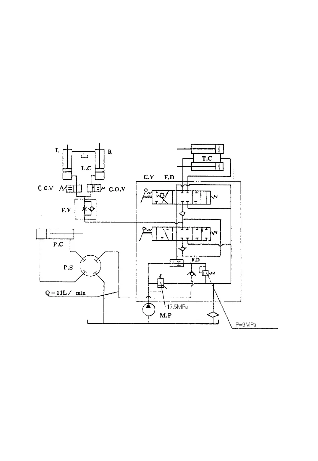 T.C.- Tilt cylinder L.C.- Lift cylinder C.V.- Control valve F.D.- Flow