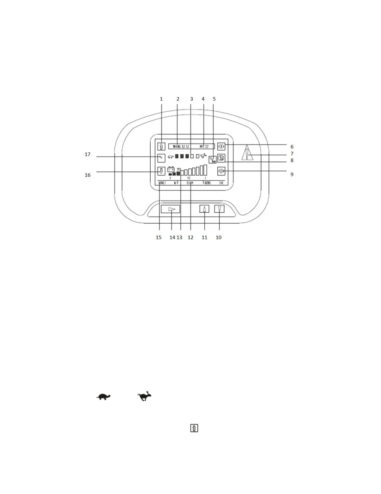 15)Hour meter display 16)Backward indication light 17)Seat switch status indicator