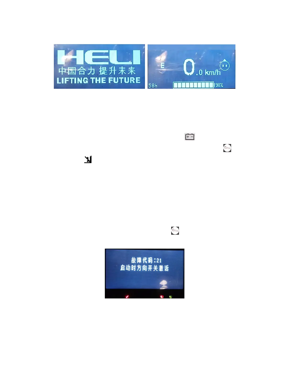 operator to charge the battery. When the 10 squares are off, fault remind figure and