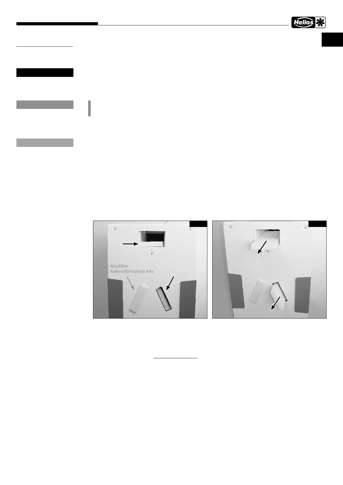 Abhängig vom Außenluftanschluss befindet sich der Abluftfilter auf der rechten (Außenluftanschluss von rechts) oder