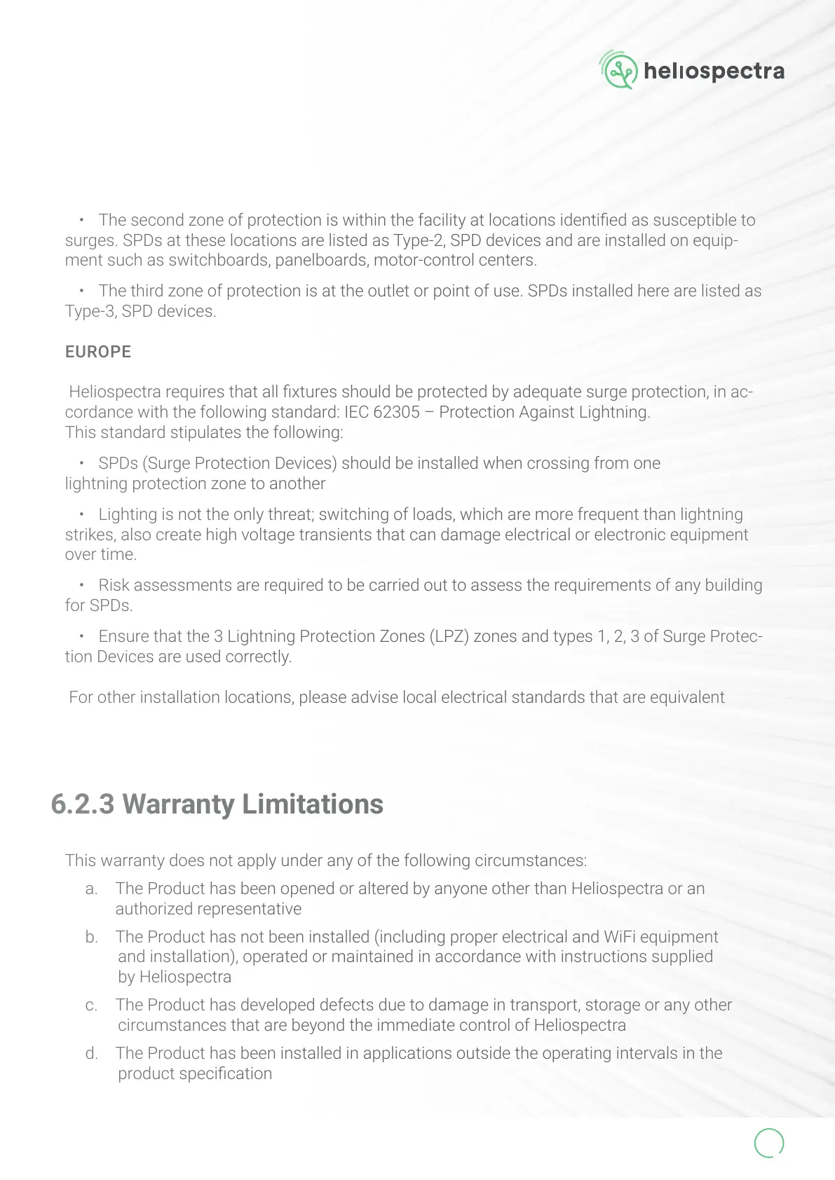 Heliospectra requires that all xtures should be protected by adequate surge protection, in ac-