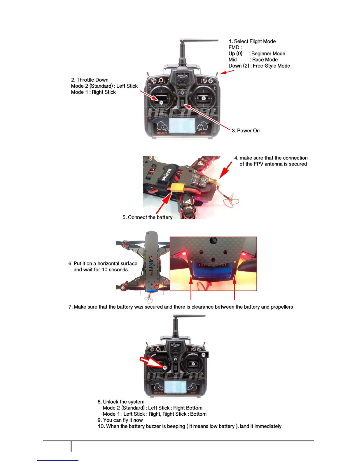 Helipal SRD250 - Quick Start Guide; Flight Mode Selection and Transmitter Setup; Drone Preparation and Connection; Initial Drone Placement and System Unlock