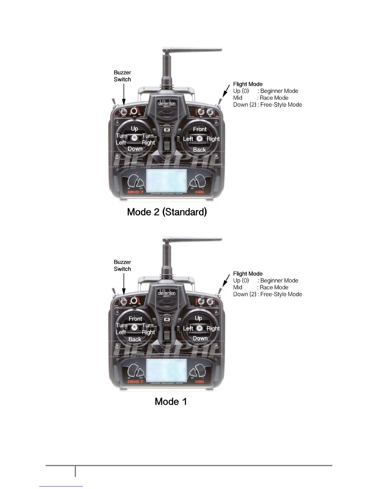 Helipal SRD250 - Flight Control Operation; Mode 2 (Standard) Control Layout; Mode 1 Control Layout