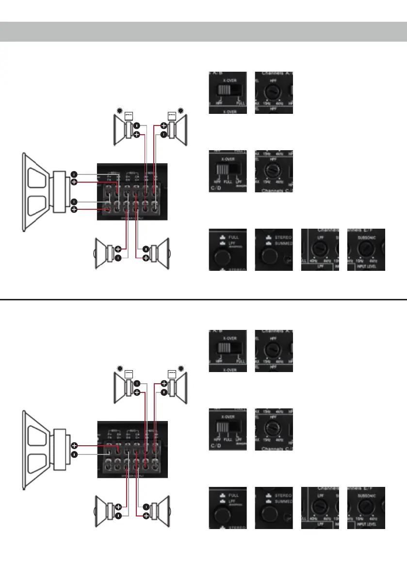 HELIX M SIX - Examples of Speaker Configurations; 6-Channel Application with 2 x2 Ohm Subwoofer; 5-Channel Application with 1 x4 Ohm Subwoofer