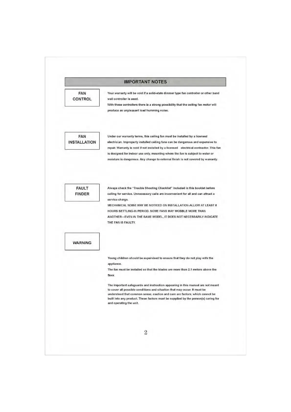 HELLER DAYNE - IMPORTANT NOTES; Fan Control and Faults; Installation and Usage Warnings