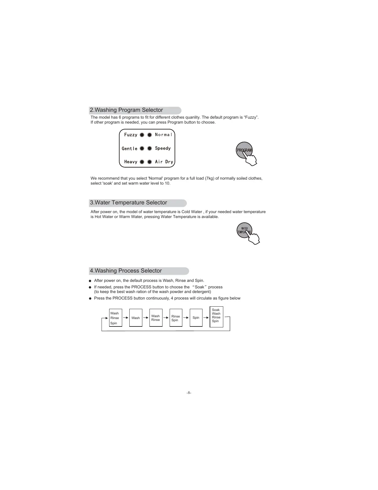 The model has 6 programs to fit for different clothes quanlity. The default program is “Fuzzy”.