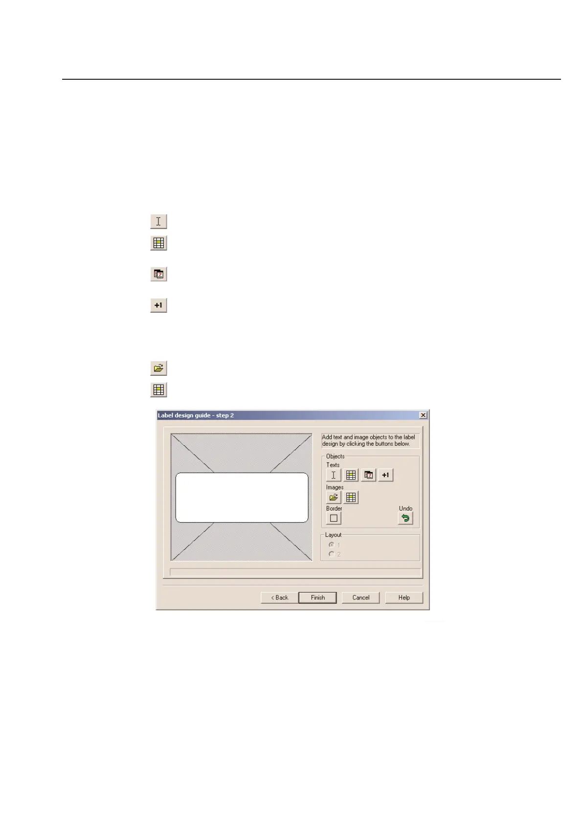 The second step in the label design guide, allows you to easily place objects on your label design. Click on a button to