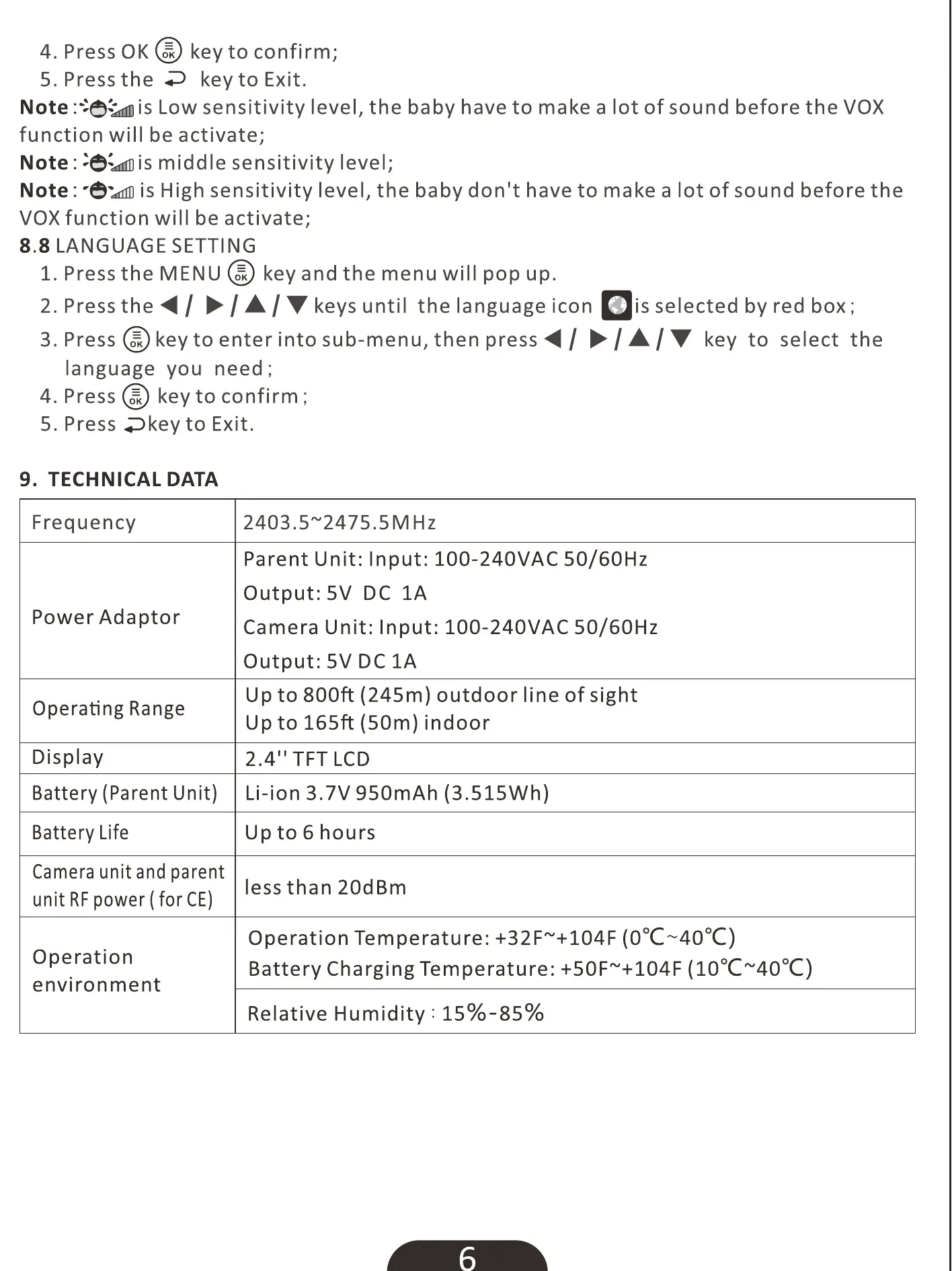 Parent Unit: Input: 100-240VAC 50/60Hz