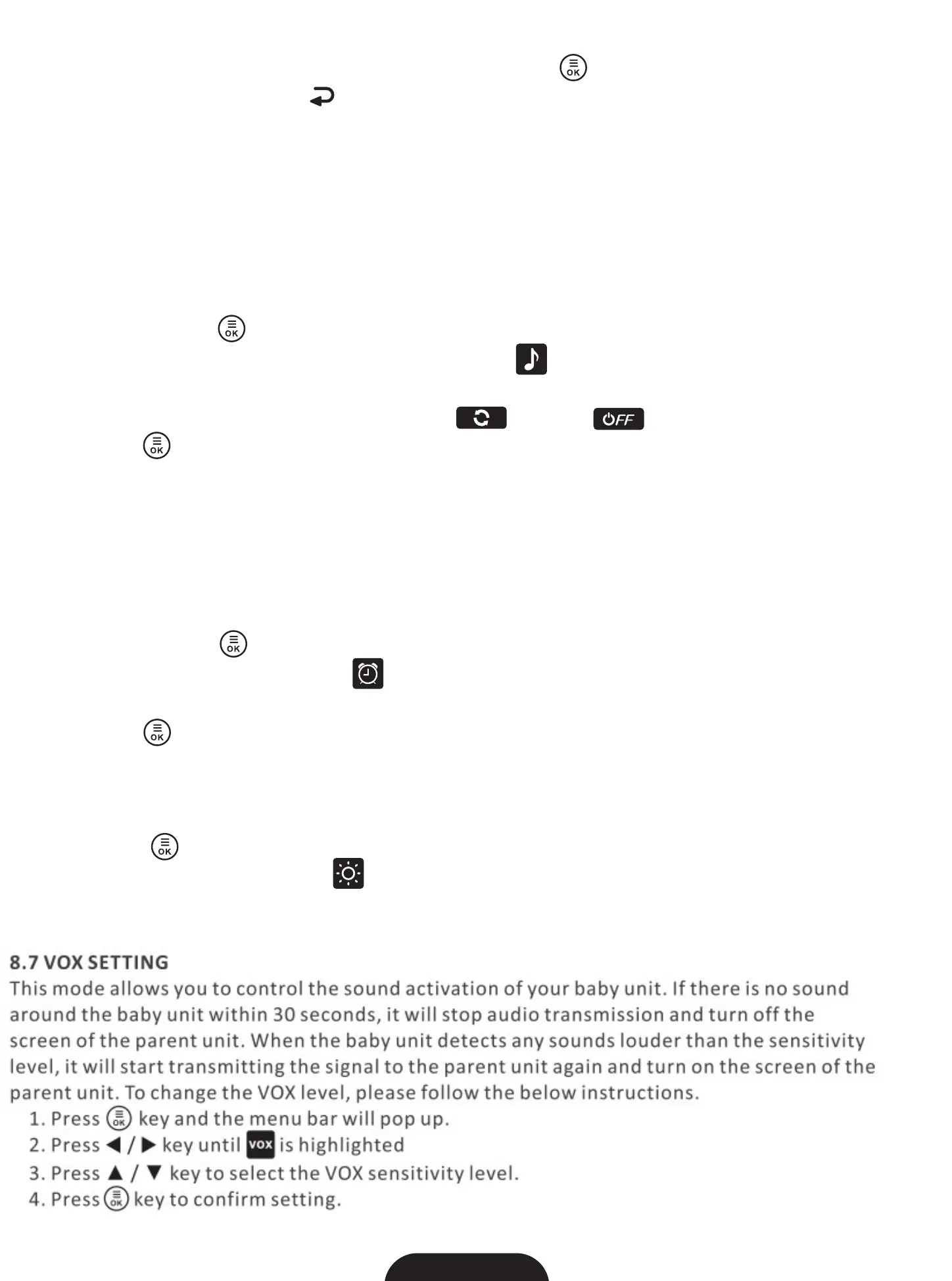 3. Press the or keys to select for the parent unit video to turn off after 5min,
