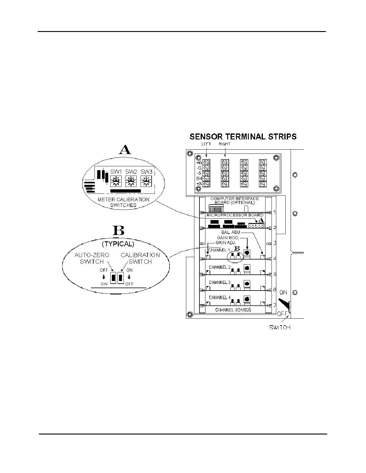 The illustration below details the locations of switches and potentiometers used during calibration.
