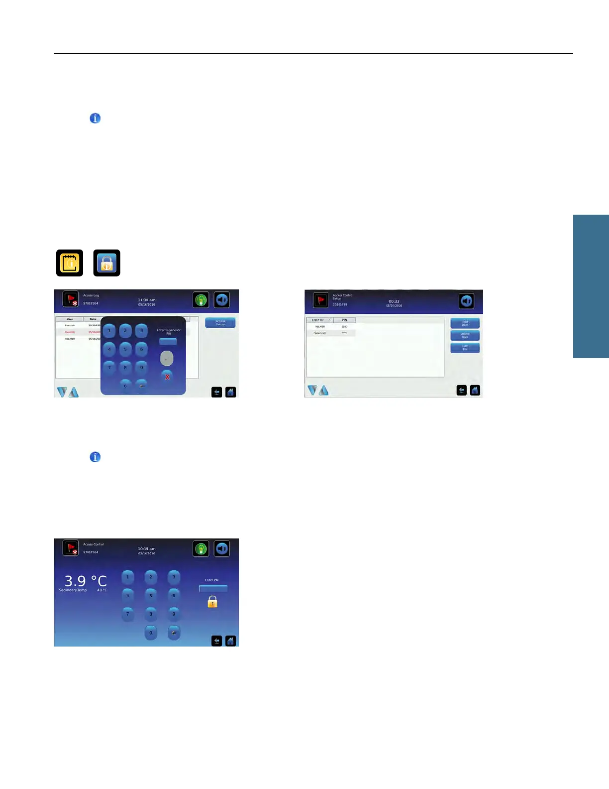 Enter the supervisor PIN to set up Access Control and follow the on-screen prompts to add, delete or edit user information.