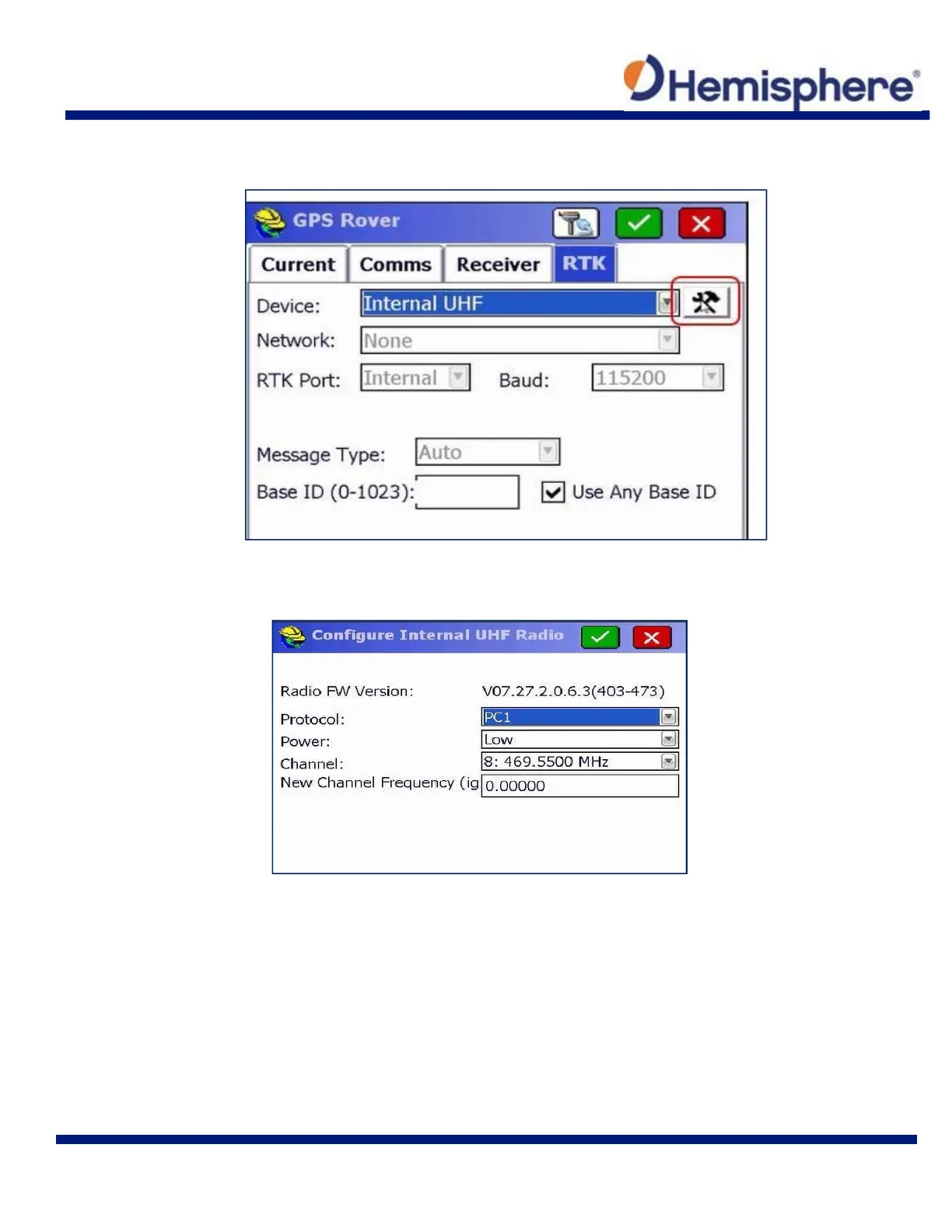 Tap the RTK tab. Under Device, select “Internal UHF” from the drop‐down list. Tap the wrench