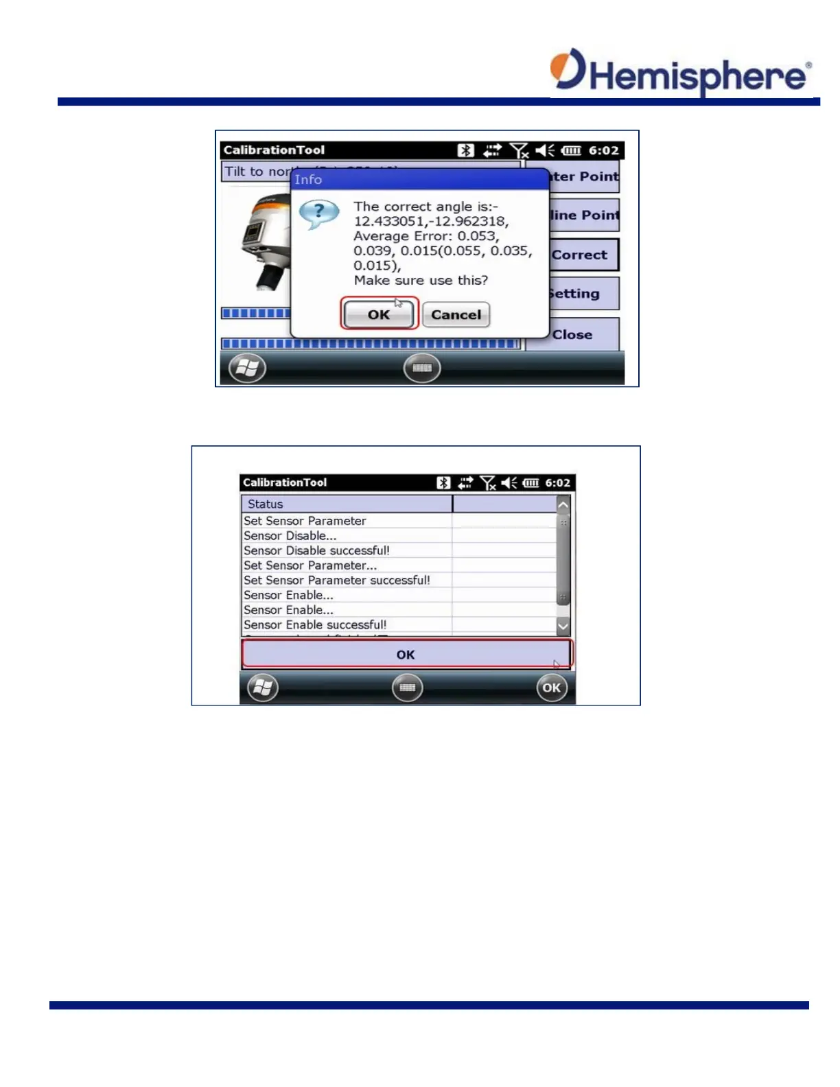 A list of messages will confirm the magnetic calibration was successful. Click the OK button. Tap