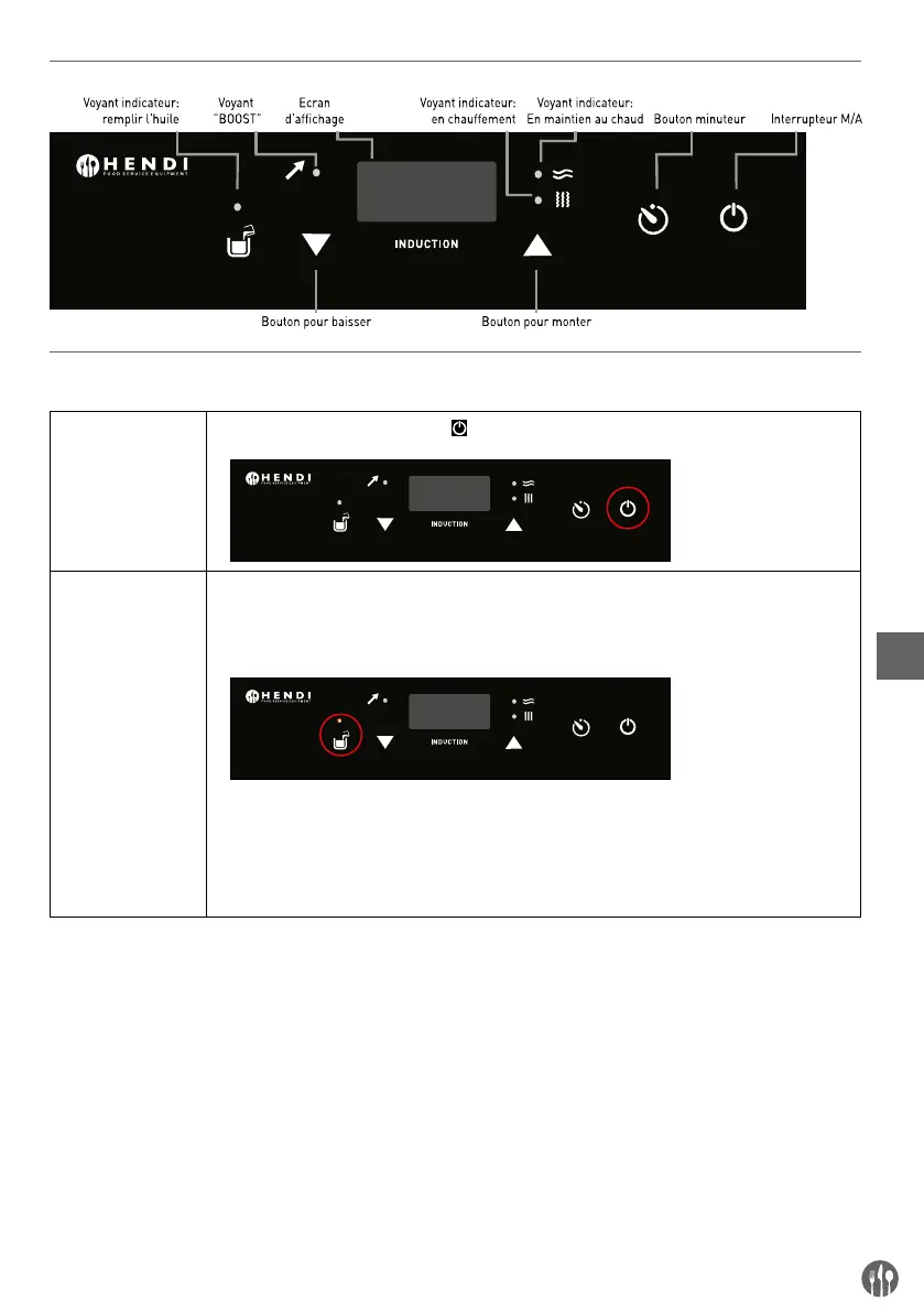 2. Préparation (a) Après que la friteuse a été allumée, l’indicateur « remplir l’huile » s’allume et l’alarme sonne afin d’avertir