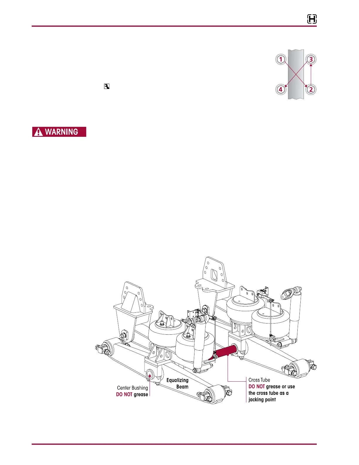 DO NOT USE THE SUSPENSION CROSS TUBE, BAR PIN AXLE BRACKETS AS A JACKING POINT, SEE