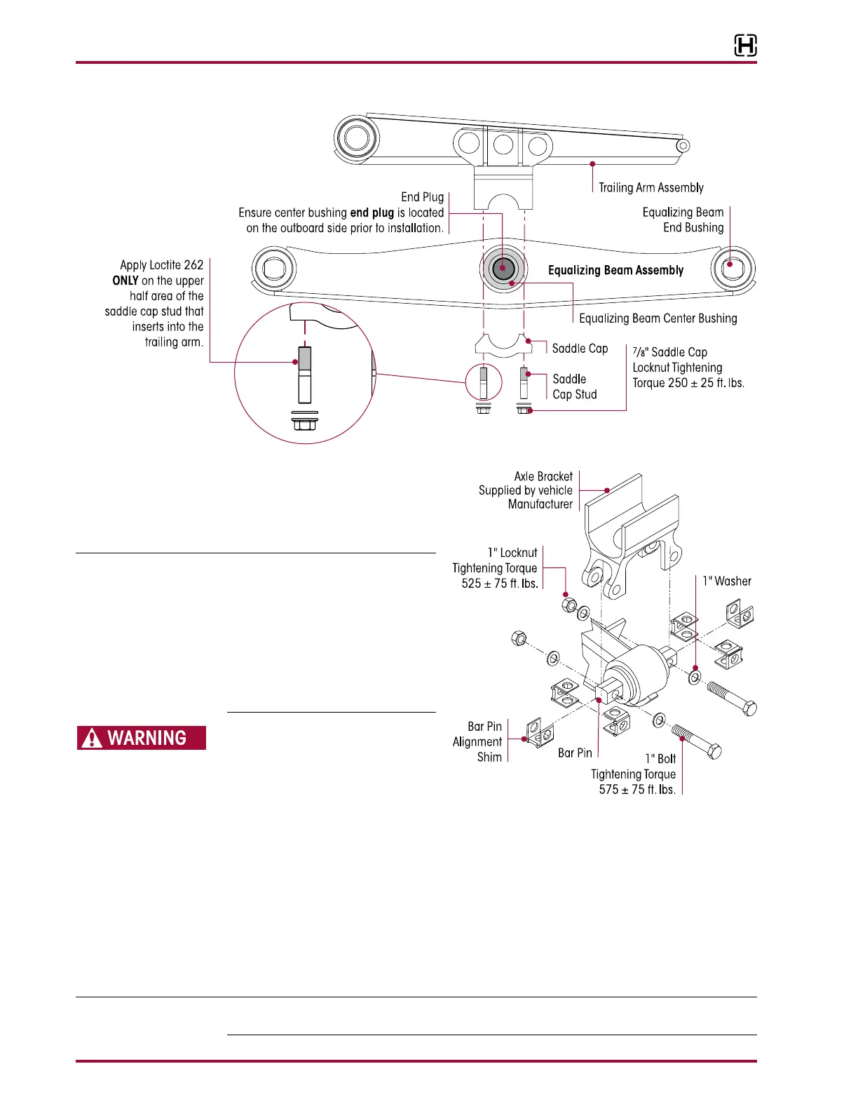 Ensure the equalizing beam’s center bushing end plug is located on the outboard side, see