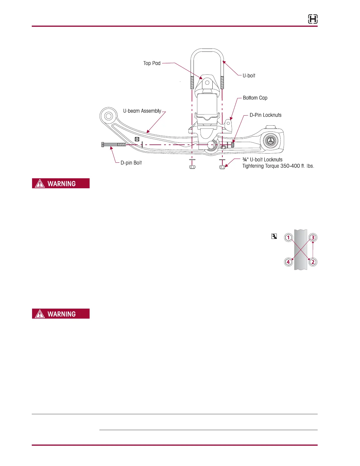 4. Tighten the U-bolt locknuts evenly in 50 foot pounds increments to