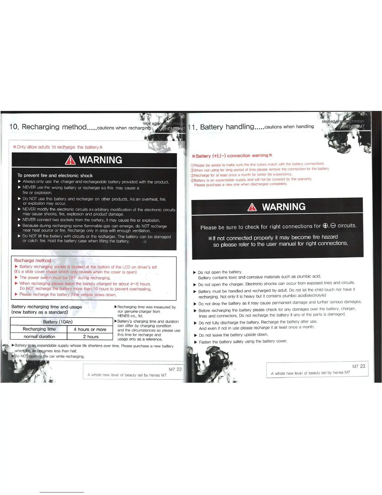 Henes M7 - Recharging Safety and Battery Management; Recharging Safety Warnings and Precautions; Battery Handling and Connection Guidelines