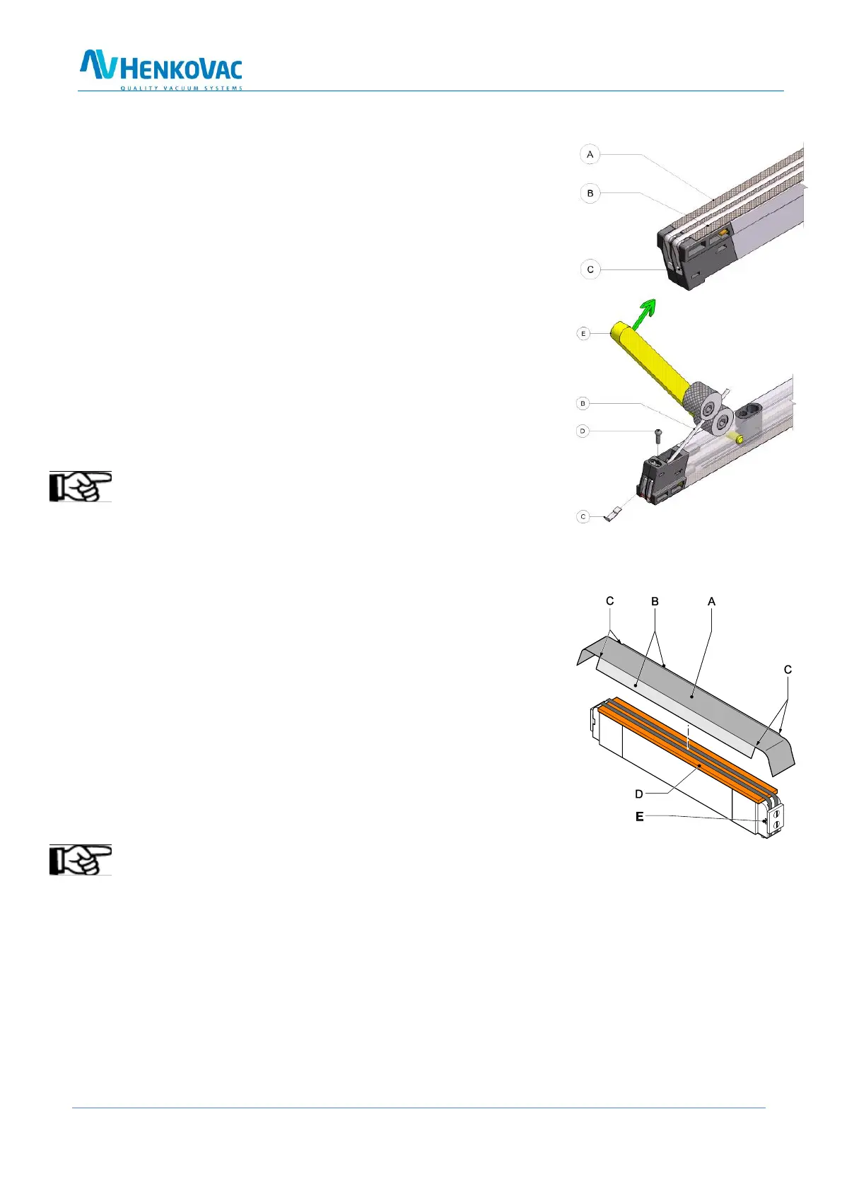 5. Slide the seal beam onto the pins in the vacuum chamber