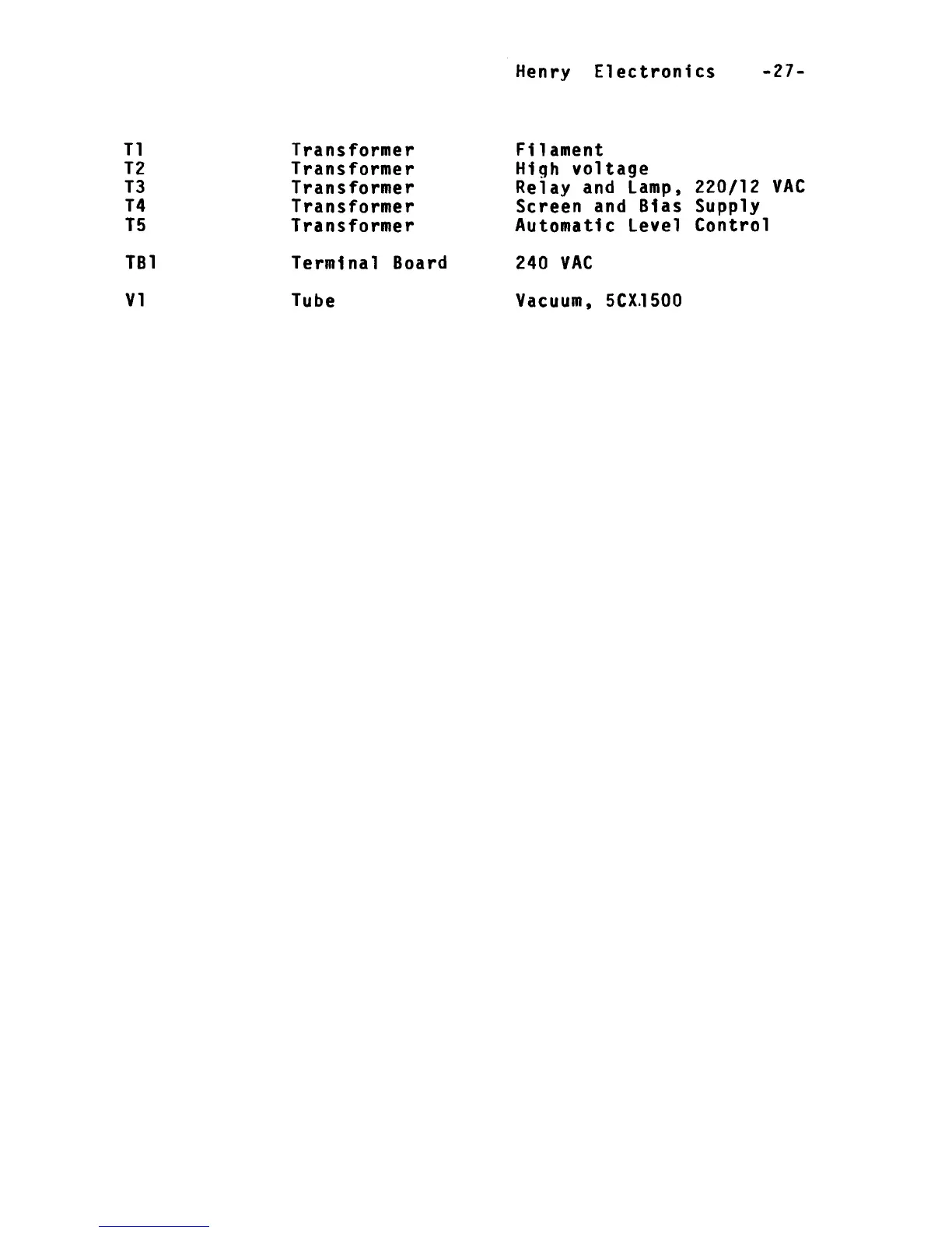 HENRY 4 K-2 - PARTS LIST FOR THE 4 K-2
