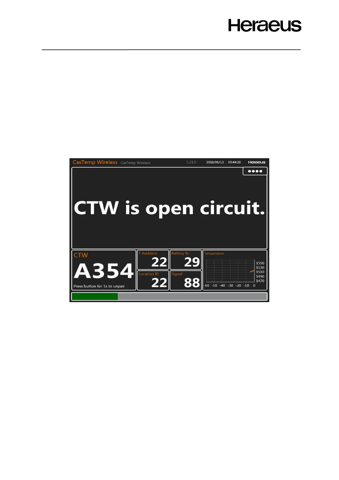 The CasTemp Wireless instrument detects that it is not receiving data and reports an open circuit as