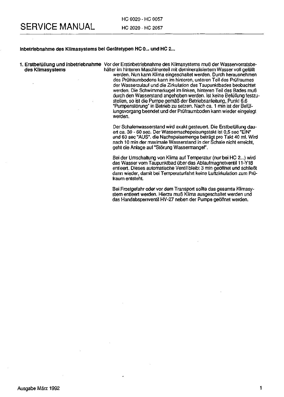 Inbetriebnahme des Klimasystems bei Geratetypen HC 0... und HC 2...