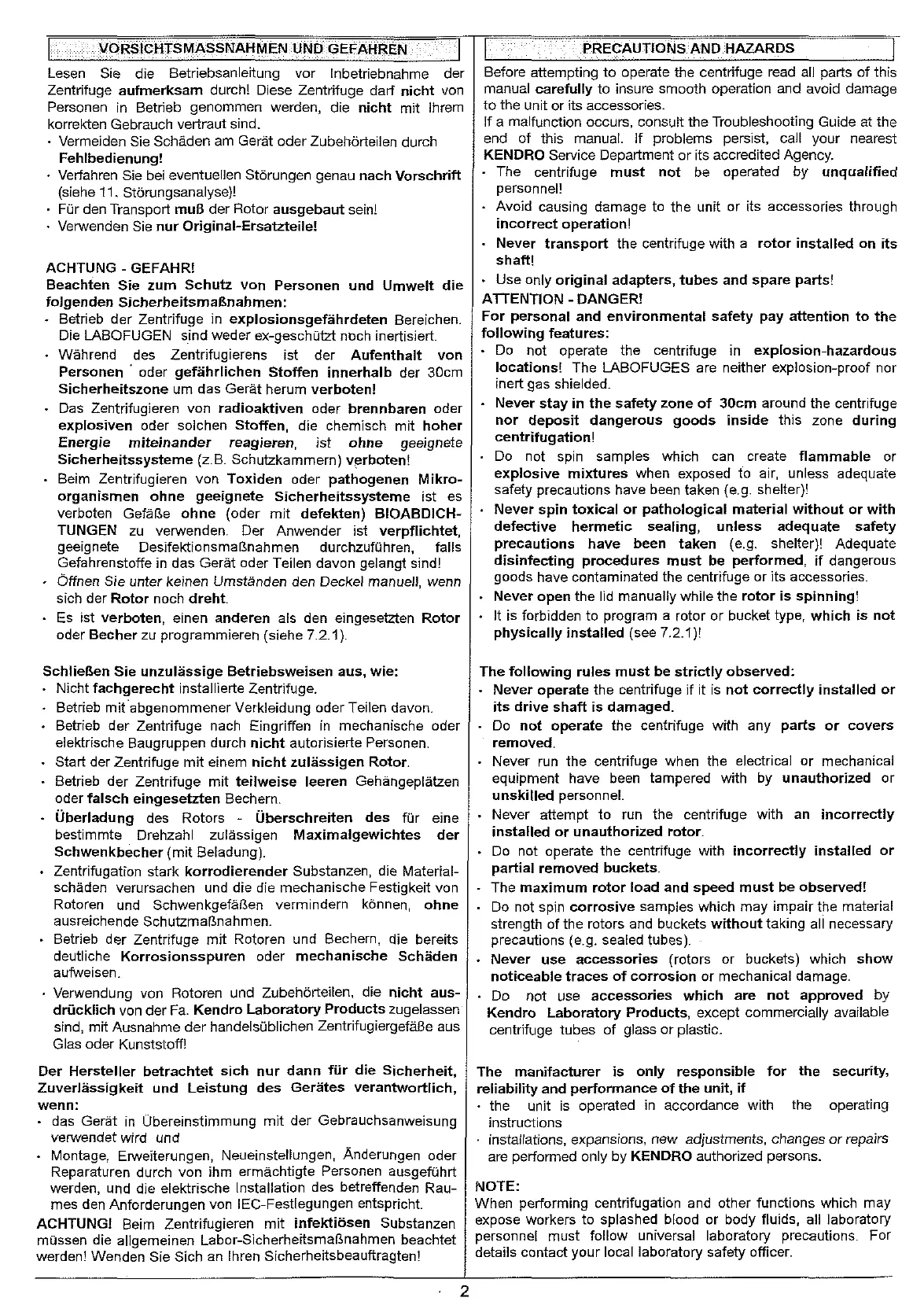Heraeus LABOFUGE 400e - Vorsichtsmassnahmen und Gefahren