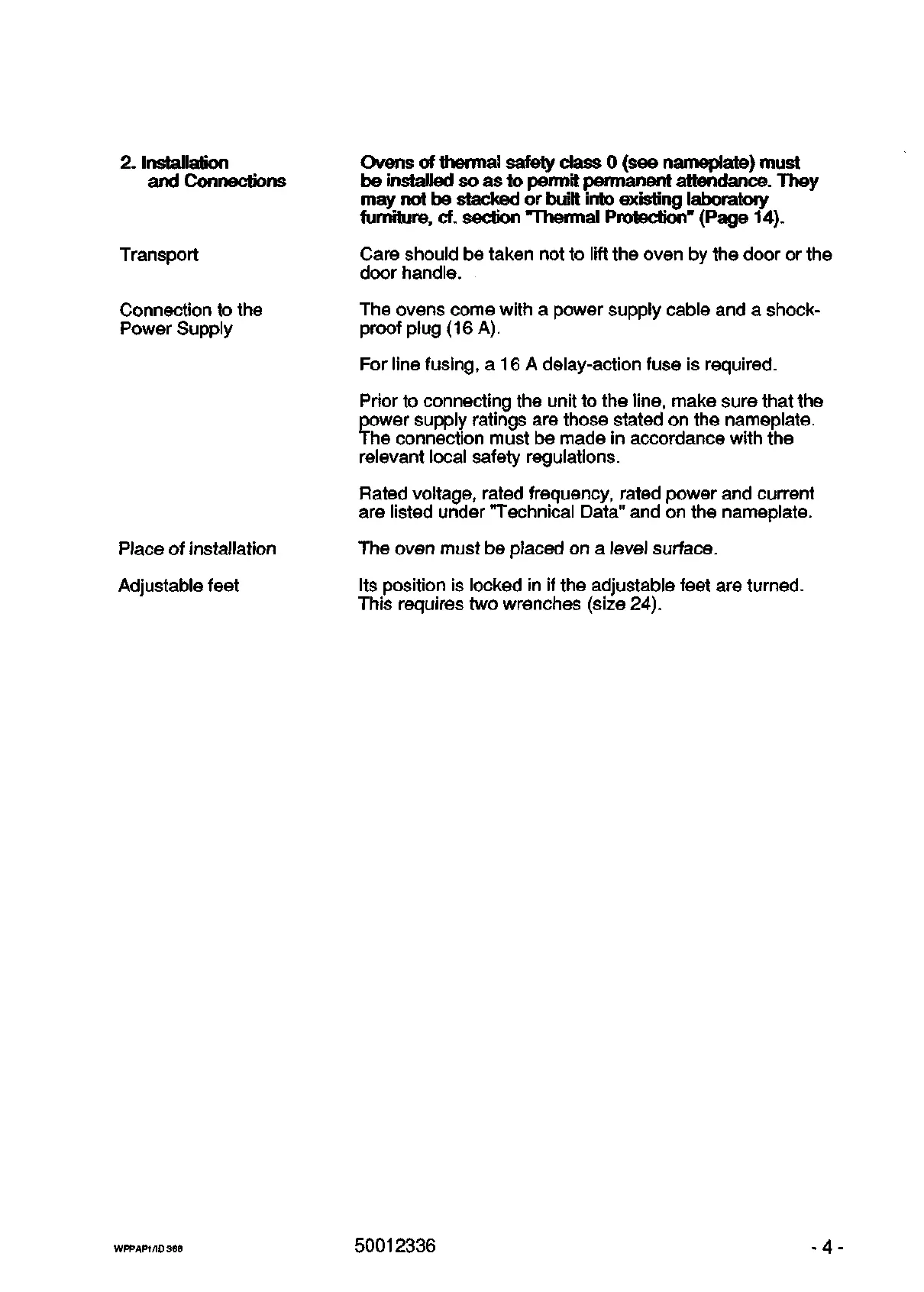 Heraeus T 6120 - 2. Installation and Connections; Transport, Power Supply, and Placement; Adjustable Feet