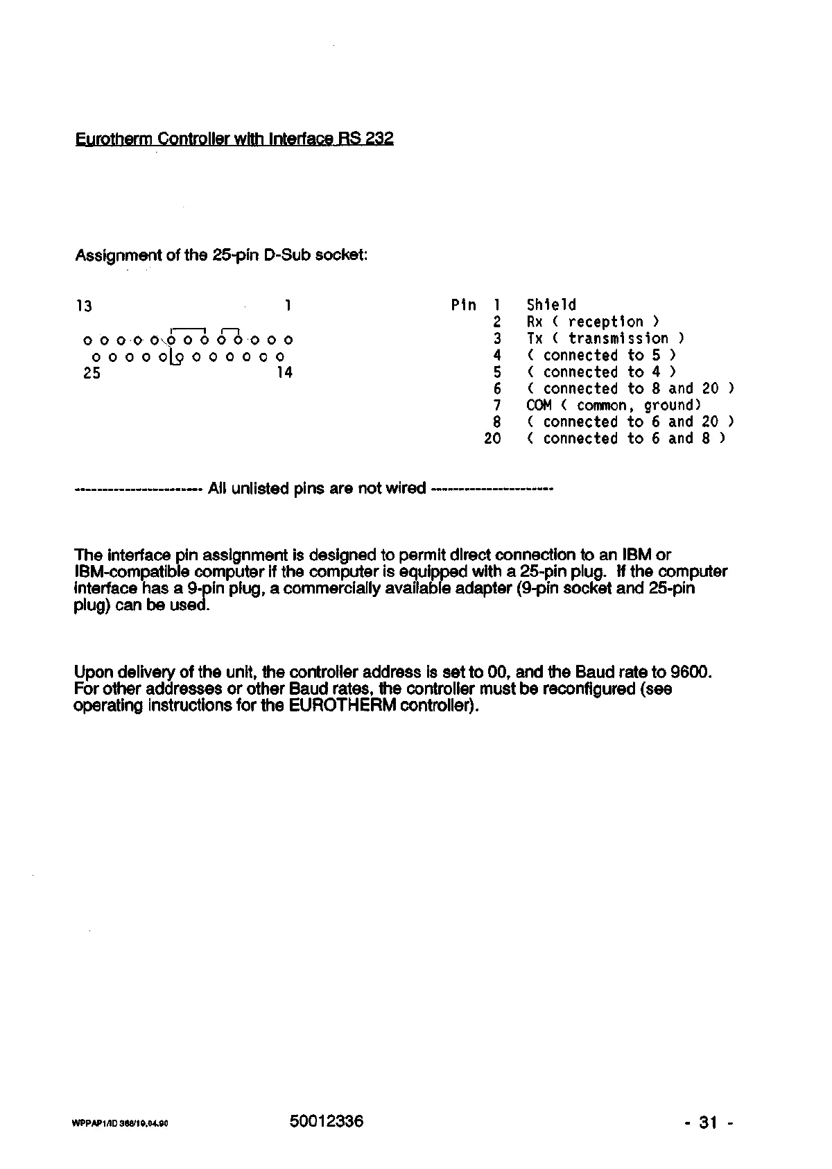 Upon delivery of the unit, the controller address is set to 00, and the Baud rate to 9600.
