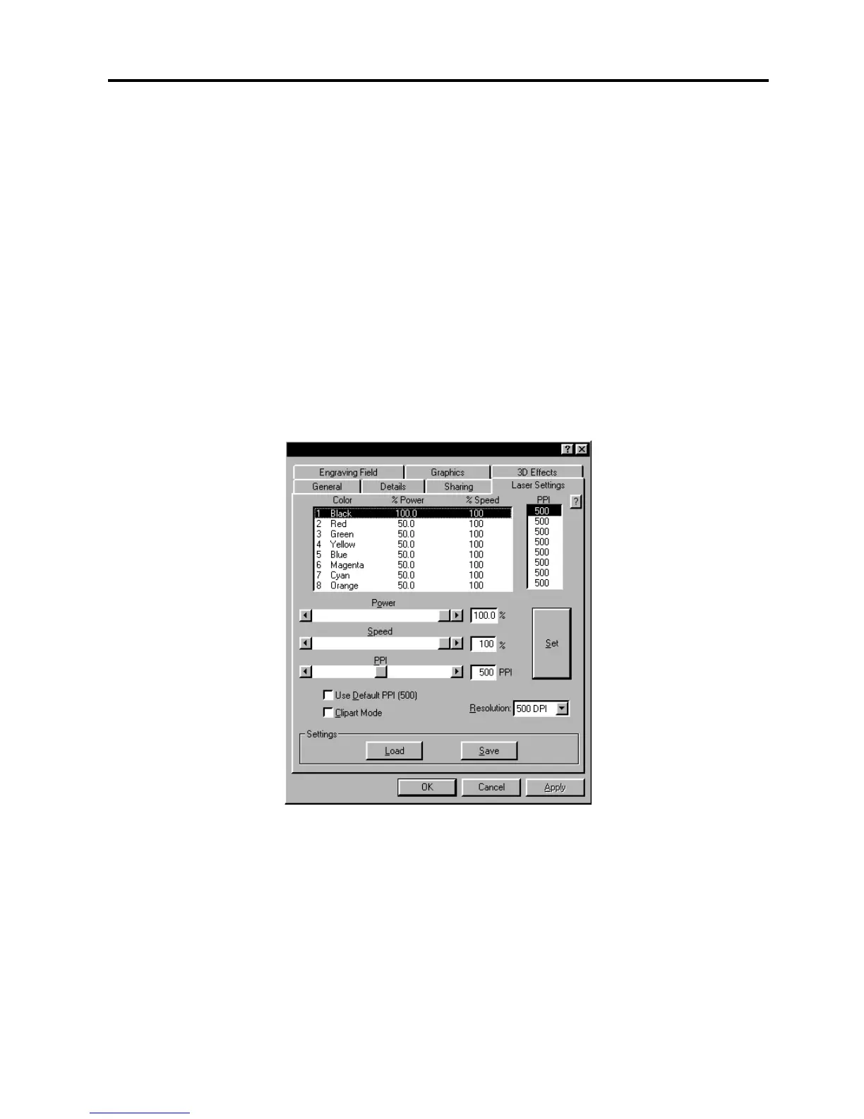The settings in this tab are primarily used to adjust the Power, Speed, and PPI of the different