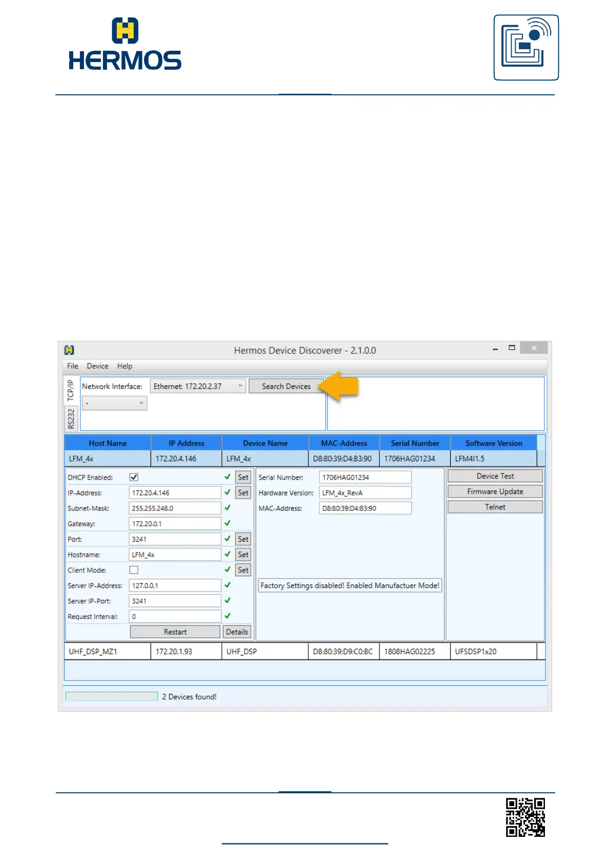 The HERMOS „DeviceDiscoverer“ is available for configuring the network setting.
