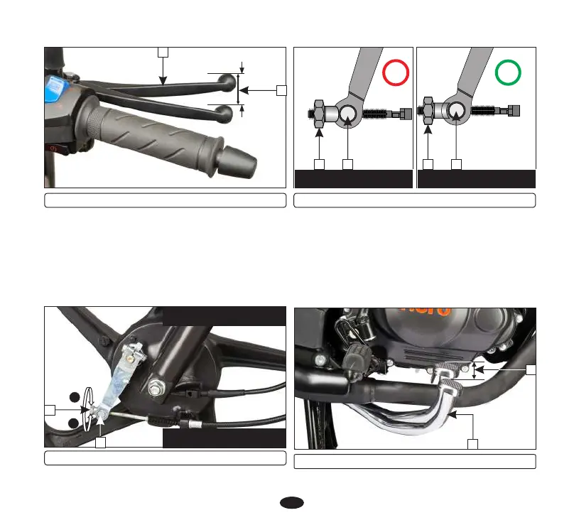 (1) Rear brake pedal (2) Free play 20-30 mm