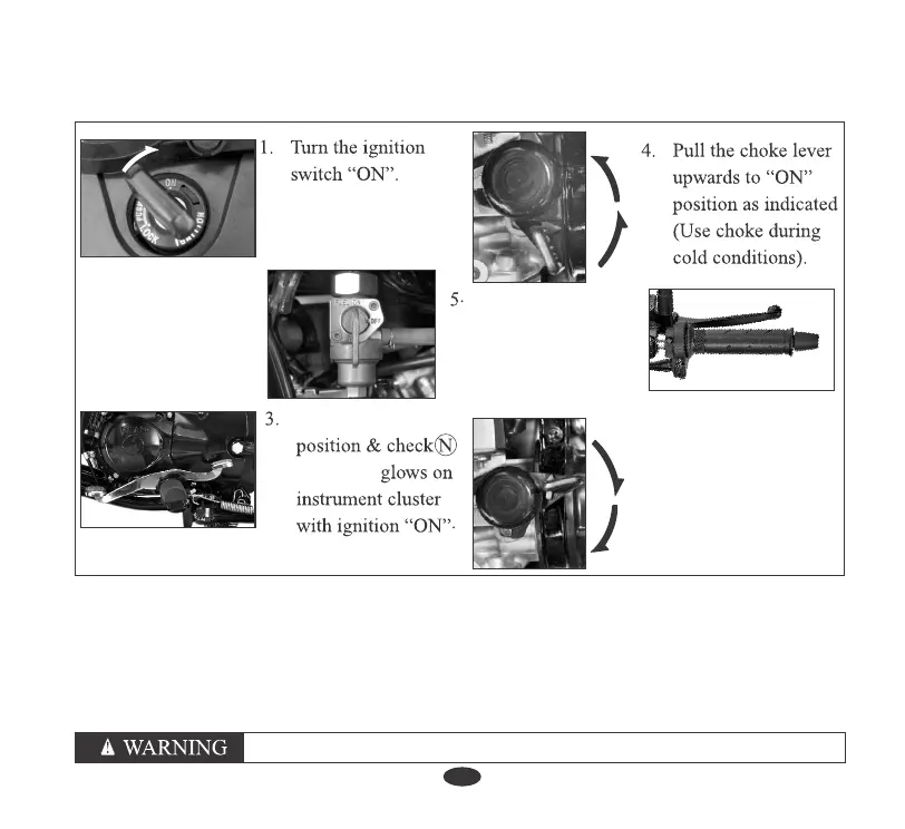 • Never attempt to kick start while motorcycle is moving forward or backward. This may lead to