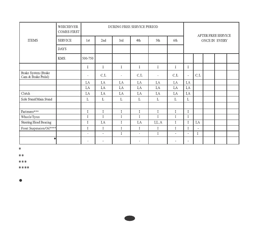 I: INSPECT R: REPLACE C: CLEAN L: LUBRICATE A: ADJUST IF REQUIRED O: OIL CHANGE T:TOP UP E: EMISSION CHECK