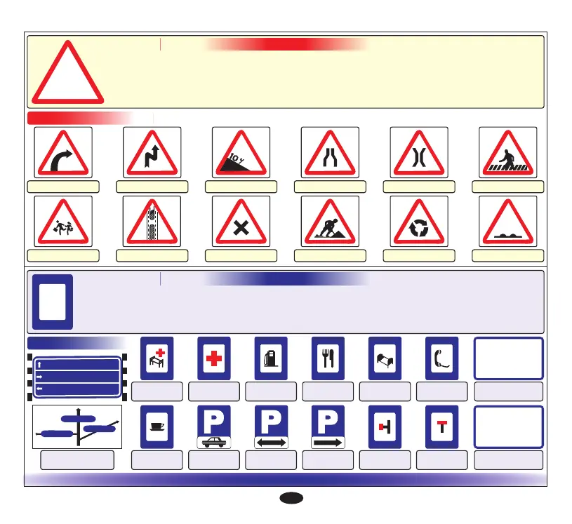 telephones, restaurants, hospitals, parking, petrol pumps, resting-places and more. These signs are