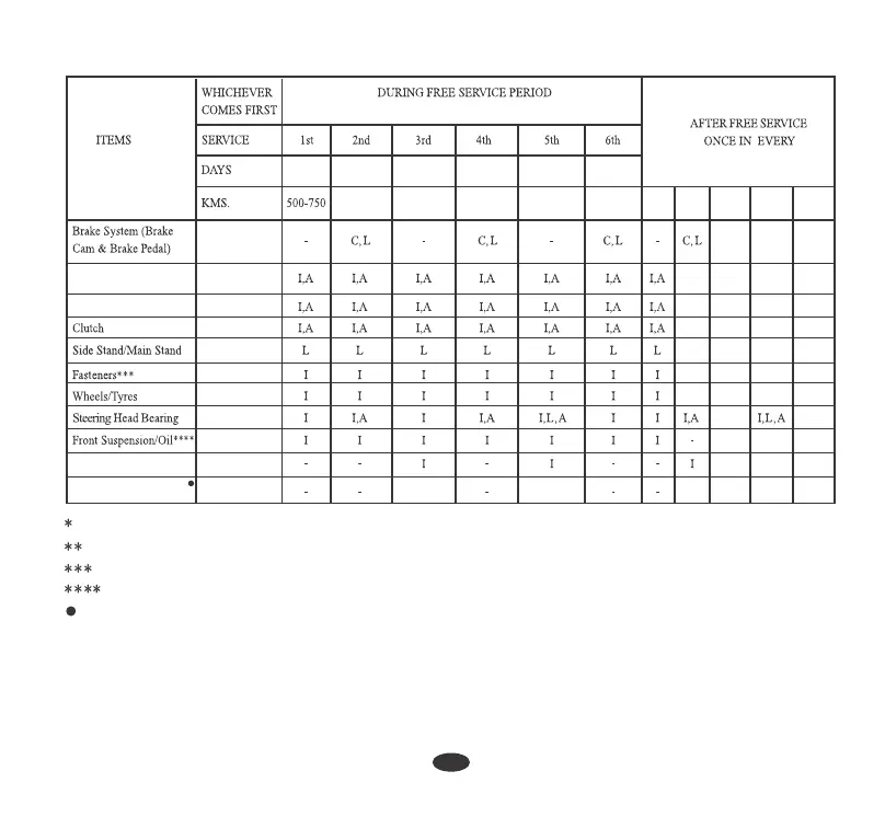 I: INSPECT R: REPLACE C: CLEAN L: LUBRICATE A: ADJUST IF REQUIRED O: OIL CHANGE T:TOP UP E: EMISSION CHECK