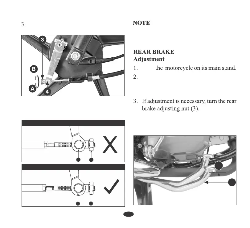 (1) Rear brake pedal (2) Free play 20-30 mm
