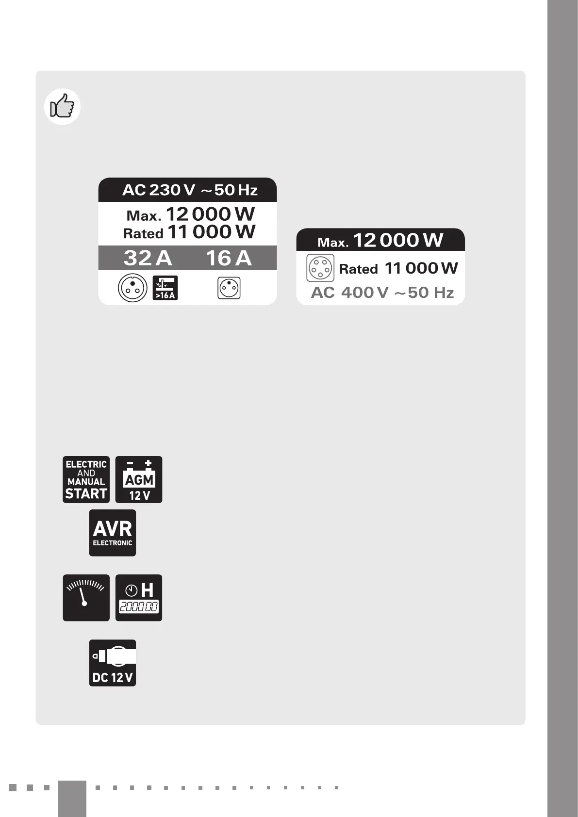 y Elektrocentrála je vybavená 32 A/230 V zásuvkou (pre odber max. 7, 3 k W) na napájanie elektrospotrebičov, ktoré
