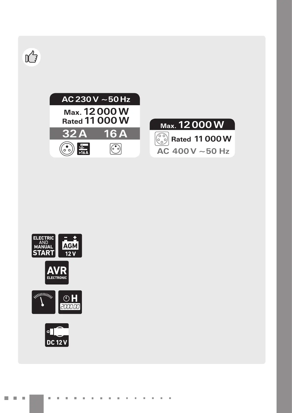 y Elektrocentrála je vybavena 32 A/230 V zásuvkou (pro odběr max. 7, 3 k W) pro napájení elektrospotřebičů, které