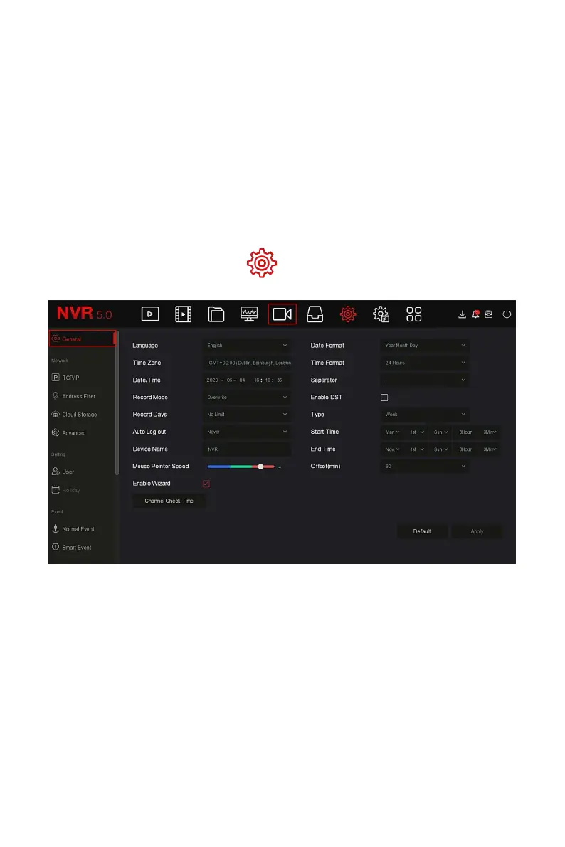 In General interface, you can view and set the NVR language, recording mode,
