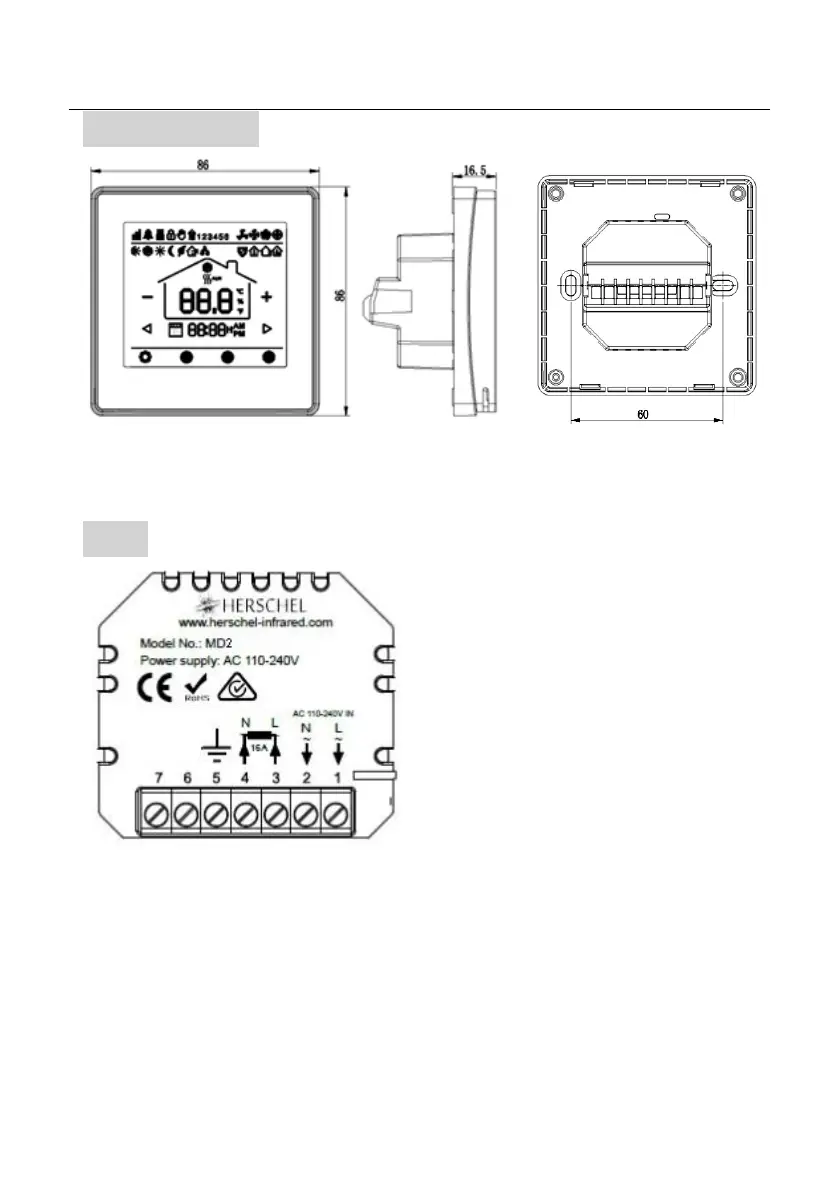 The MD2 is 86mm x 86mm and the front display is 16.5mm thick. A single gang pattress box 46mm deep is