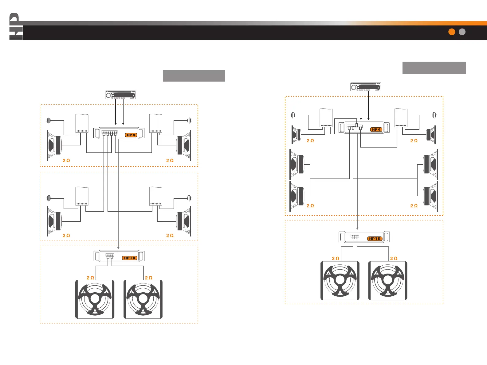 Negli schemi è indicata l’impedenza minima sopportata dall’amplificatore nella configurazione mostrata Negli schemi è indicata l’impedenza minima sopportata dall’amplificatore nella configurazione mostrata