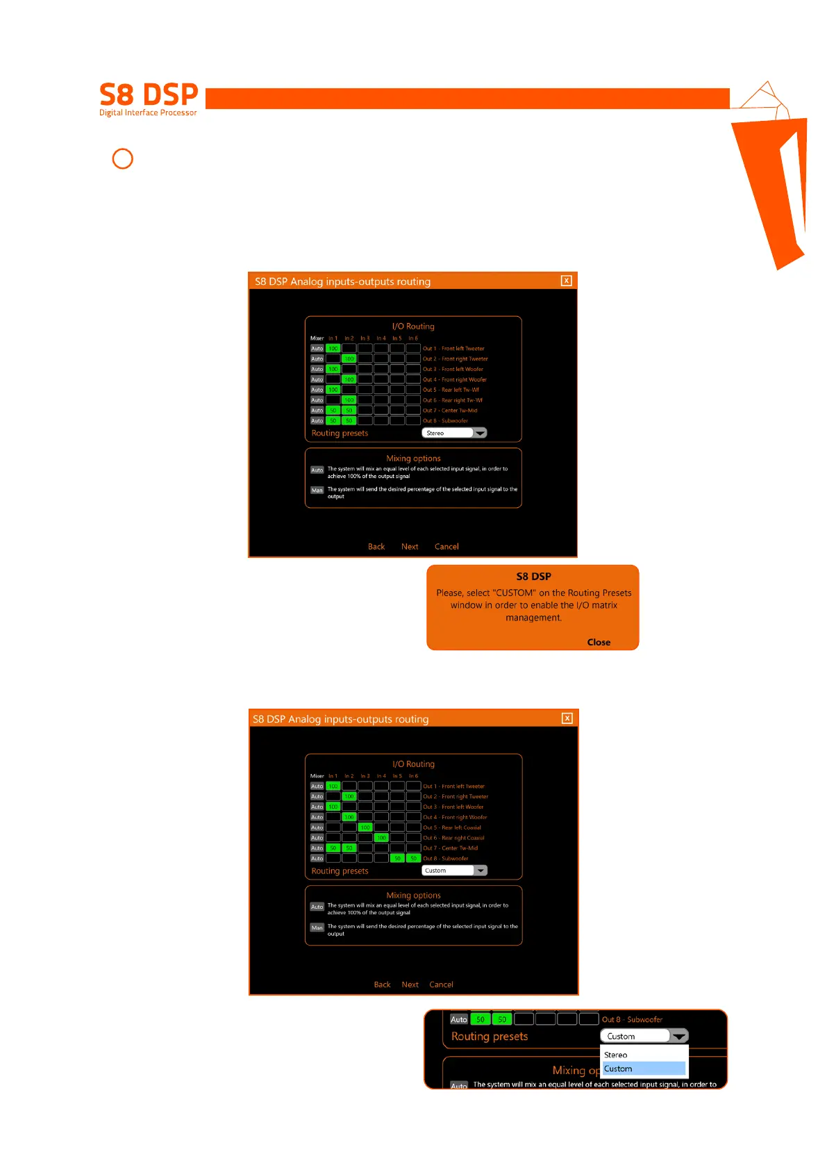 ROUTING/PRESET: it is possible to assign inputs to outputs in two ways (STEREO) or (CUSTOM).