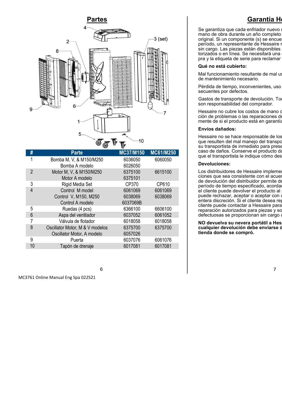 período, un representante de Hessaire reemplazará la pieza defectuosa