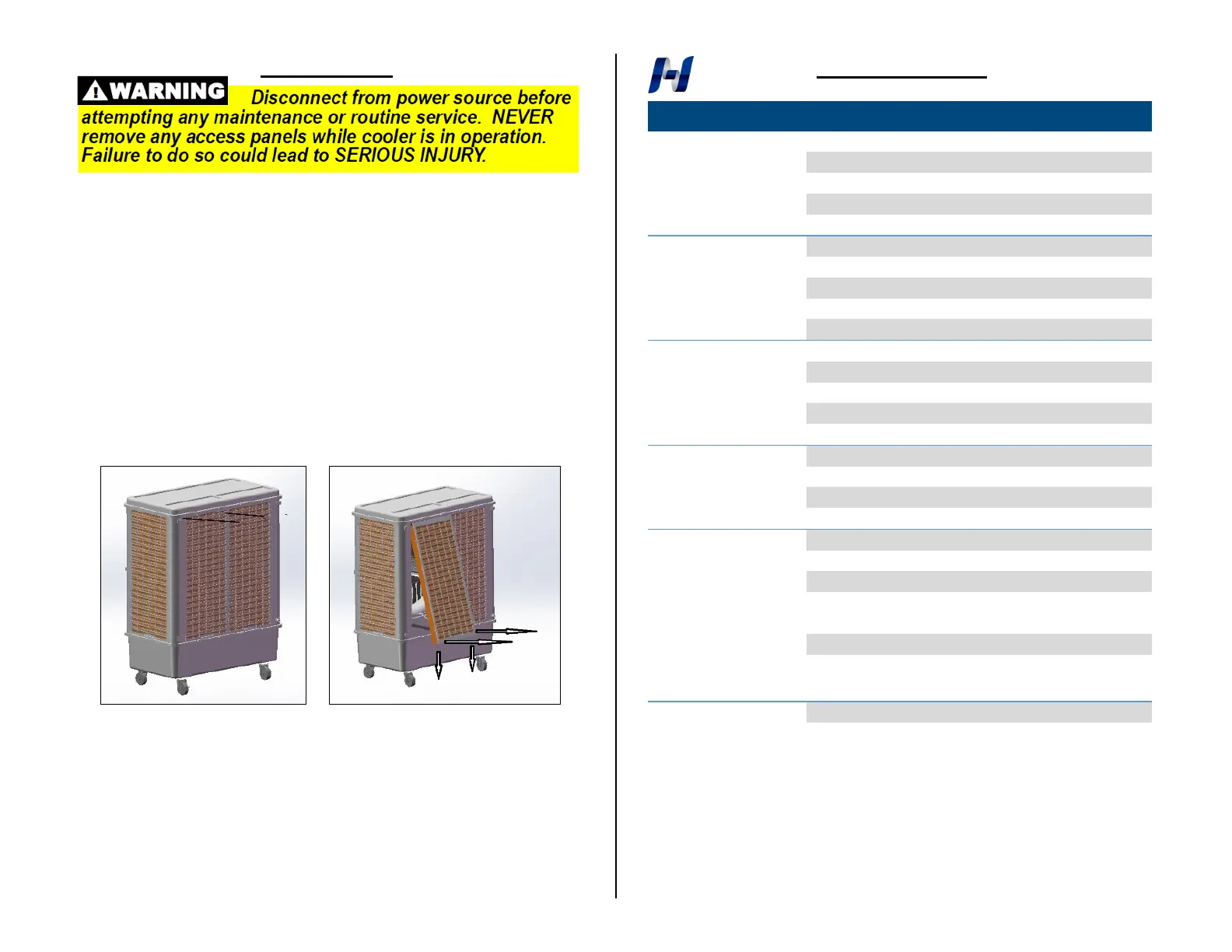 NEVER spray pads with water while cooler is in operation.