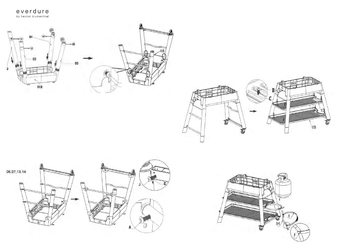 washers (E). When all are assembled, tighten up all four screws and the screws from step