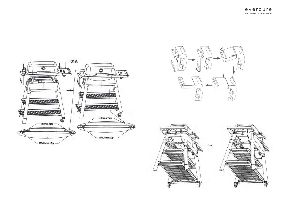 castors to the right). Fix the barbeque to the stand top with the four M6x0.8in (20mm)
