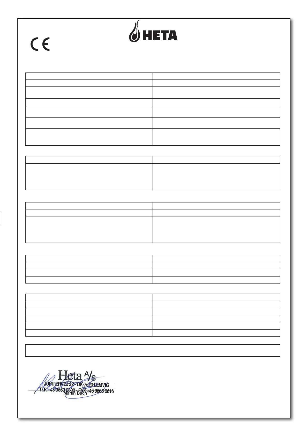 4. Name and contact address of the manufacturer Heta A/S, Jupitervej 22, DK-7620 Lemvig. heta@heta.dk