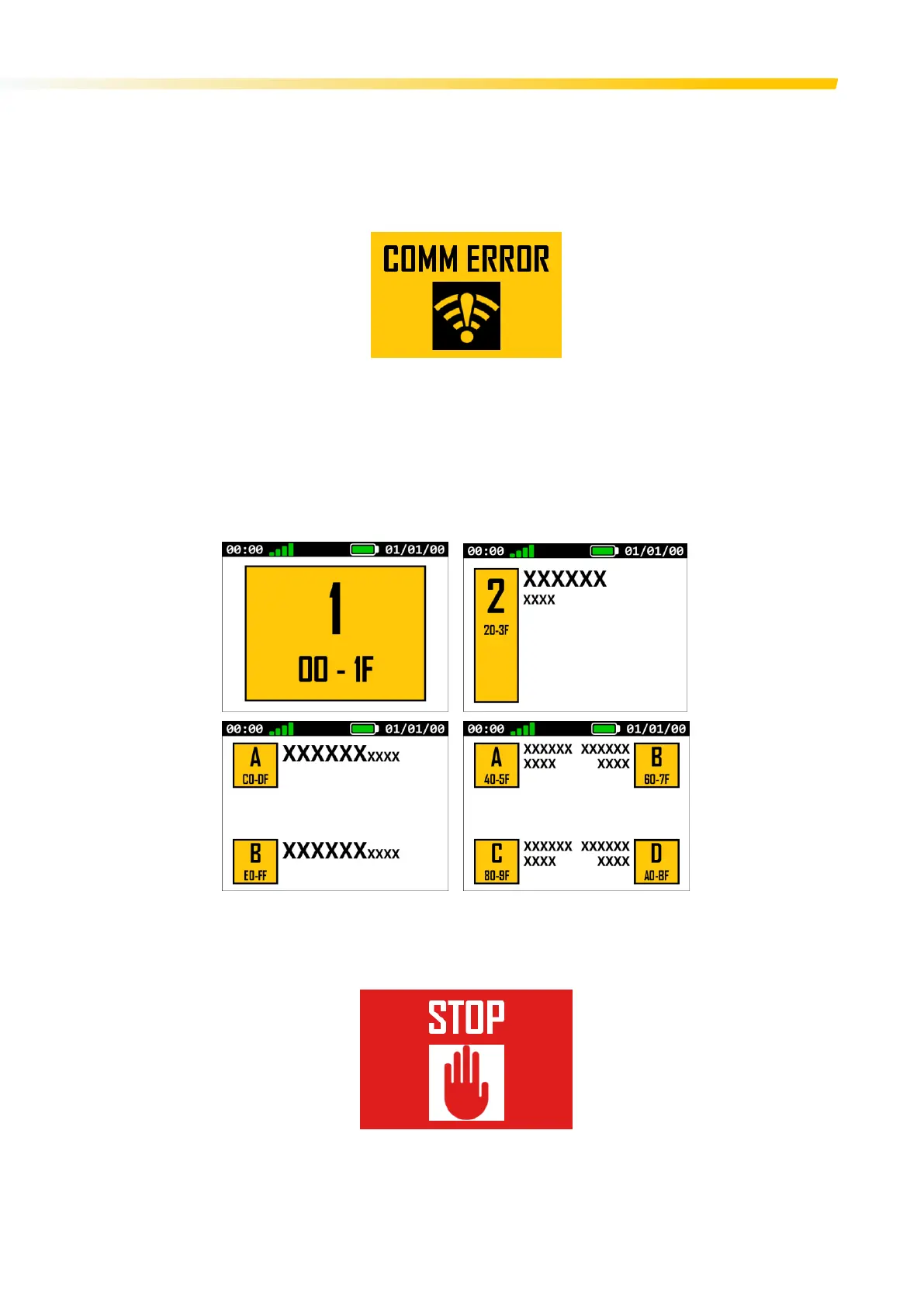 The STOP screen is displayed whenever the Transmitter is in STOP mode. This can be achieved when in Active (User manually activates